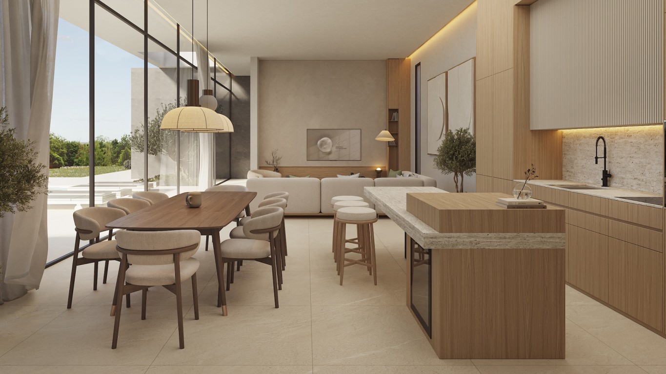 Diseñada por el arquitecto Pepe Giner, esta elegante villa se distribuye en una sola planta para máxima comodidad y accesibilidad. Con más de 180 m² construidos, la casa cuenta con 3 amplios dormitorios, un amplio salón-comedor de planta abierta, varios baños, lavadero, amplio espacio de almacenamiento y amplias terrazas exteriores.