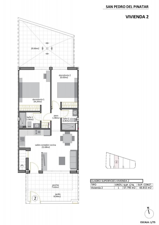 Nieuwbouwbungalows in San Pedro del Pinatar Toplocatie Slechts 500 meter van het strand Exclusieve boetiekwoningen vlakbij de kust Ontdek deze elegante nieuwbouwbungalows in het hart van San Pedro del Pinatar, op slechts 500 meter van de prachtige stranden van de Mar Menor. Dit boetiekproject omvat slechts acht unieke woningen, die modern design, comfort en een rustige kustlevensstijl combineren. Beschikbare modellen die bij uw levensstijl passen Tuin/Begane grondmodel: Beschikt over een terras aan de voorzijde en een ruim terras aan de achterzijde, perfect om buiten te leven. Penthouse Loft-model: Inclusief een privé dakterras en een terras aan de voorzijde, met een vrij uitzicht en veel zonlicht. Details Tuin/Begane grondmodel Stap binnen in een lichte woonruimte die naadloos overgaat in de eetkamer en een volledig uitgeruste keuken. Grote schuifdeuren van glas laten natuurlijk licht binnen en creëren een open en uitnodigende sfeer. De indeling omvat twee ruime slaapkamers, waarvan de hoofdslaapkamer een en-suite badkamer heeft, evenals een moderne gezinsbadkamer. Hoogtepunten Penthouse-model Toegang tot het penthouse via een privétrap die leidt naar een groot terras. Binnen combineert de woning een open woon- en eetkamer met een volledig ingerichte keuken. Er zijn twee slaapkamers, waarvan de hoofdslaapkamer een eigen badkamer heeft. Een privé dakterras, bereikbaar vanuit de keuken, biedt een ideale plek om te ontspannen of gasten te ontvangen. Extra bergruimte op de begane grond zorgt voor extra gemak. Belangrijkste kenmerken en voorzieningen: LED-verlichting binnen en buiten. Volledig ingerichte keuken met inductiekookplaat, oven, vaatwasser en koelkast/vriezer. Airconditioning. Eigen parkeerplaats. Aangelegde gemeenschappelijke tuin met zwembad voor bewoners. San Pedro del Pinatar: Kustcharme en gemak. Gelegen aan de prachtige Mar Menor en de Middellandse Zee, is San Pedro del Pinatar een paradijs voor watersportliefhebbers, zeilers en strandgangers. Het nabijgelegen Lo Pagán biedt natuurlijke modderbaden, rustig water en het hele jaar door voorzieningen, waaronder winkels, restaurants en recreatiemogelijkheden. Afstanden tot belangrijke bezienswaardigheden: Winkelcentrum Dos Mares: 5 km Luchthaven Murcia/Corvera: 30 km Luchthaven Alicante: 75 km Lokale golfbanen: 1020 km Jachthaven en zeilclubs: 2 km Reserveer vandaag nog uw droomhuis! Met een verwachte oplevering eind 2025 is dit hét moment om uw nieuwe woning in San Pedro del Pinatar te bemachtigen. Mis deze kans niet om te genieten van een combinatie van moderne elegantie en de rust van de kust.