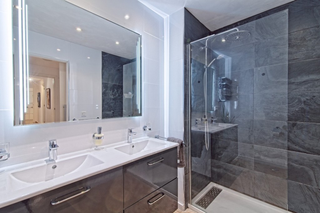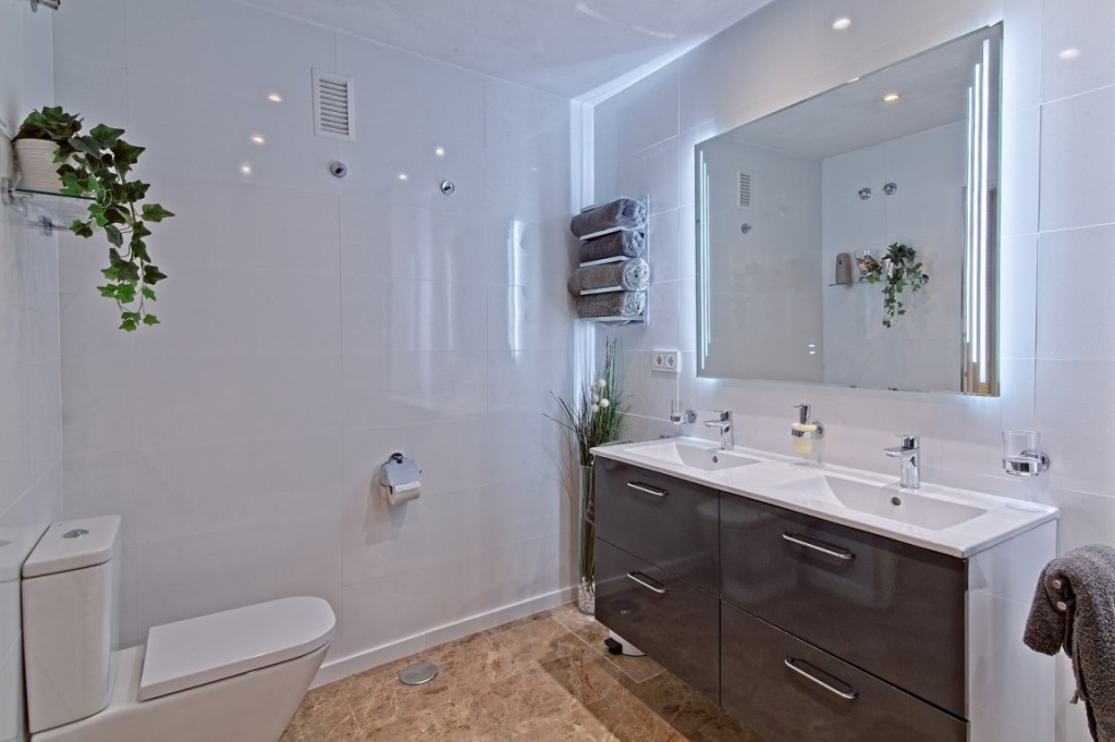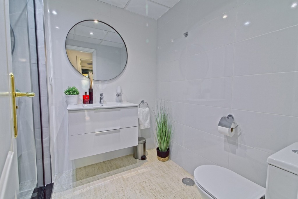 The second bathroom also has high-standard fixtures and fittings, offering a full-sized walk-in thermo-controlled shower and floating vanity units. In addition to the two full bathrooms, there is also a guest WC adjacent to the living area.