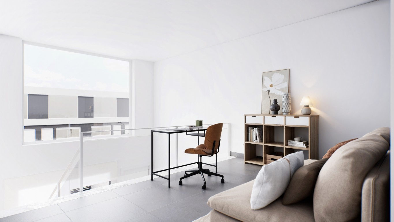 Ett hus med en linjär och modern design både utvändigt och invändigt. Det kännetecknas av sitt stora glasfasad som ger naturligt ljus till huset praktiskt taget hela dagen. Husen är fördelade i två höjder, duplextyp, med en trätrappa i linjära och enkla utföranden. Utanför har det en 25 m2 parkeringsplats och en bakgård. Det har en gemensam pool. Huset kan fördelas i 1, 2 eller till och med 3 sovrum, med ett separat eller amerikanskt kök, 1 eller 2 badrum eller möjligheten att välja stora öppna och genomskinliga ytor istället för sovrum. HUSKOMBINATIONER